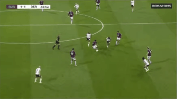 35’克拉克摆脱防守球员推射破门,德比郡1-1伯恩利